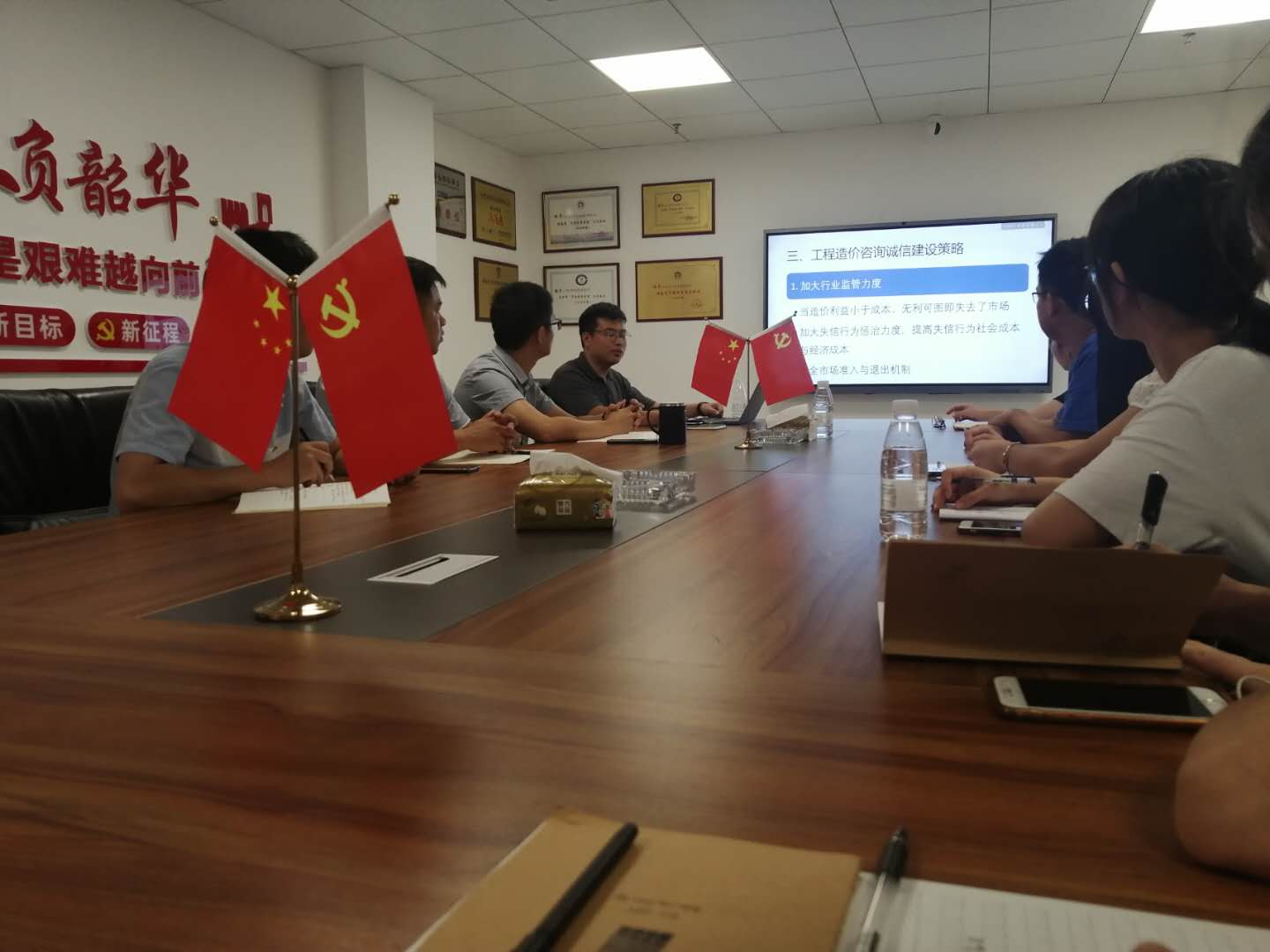 2020年8月24日下午,总经理梁巨权组织公司在职员工在党建活动室召开以“工程造价咨询诚信建设博弈分析”为主题的会议。